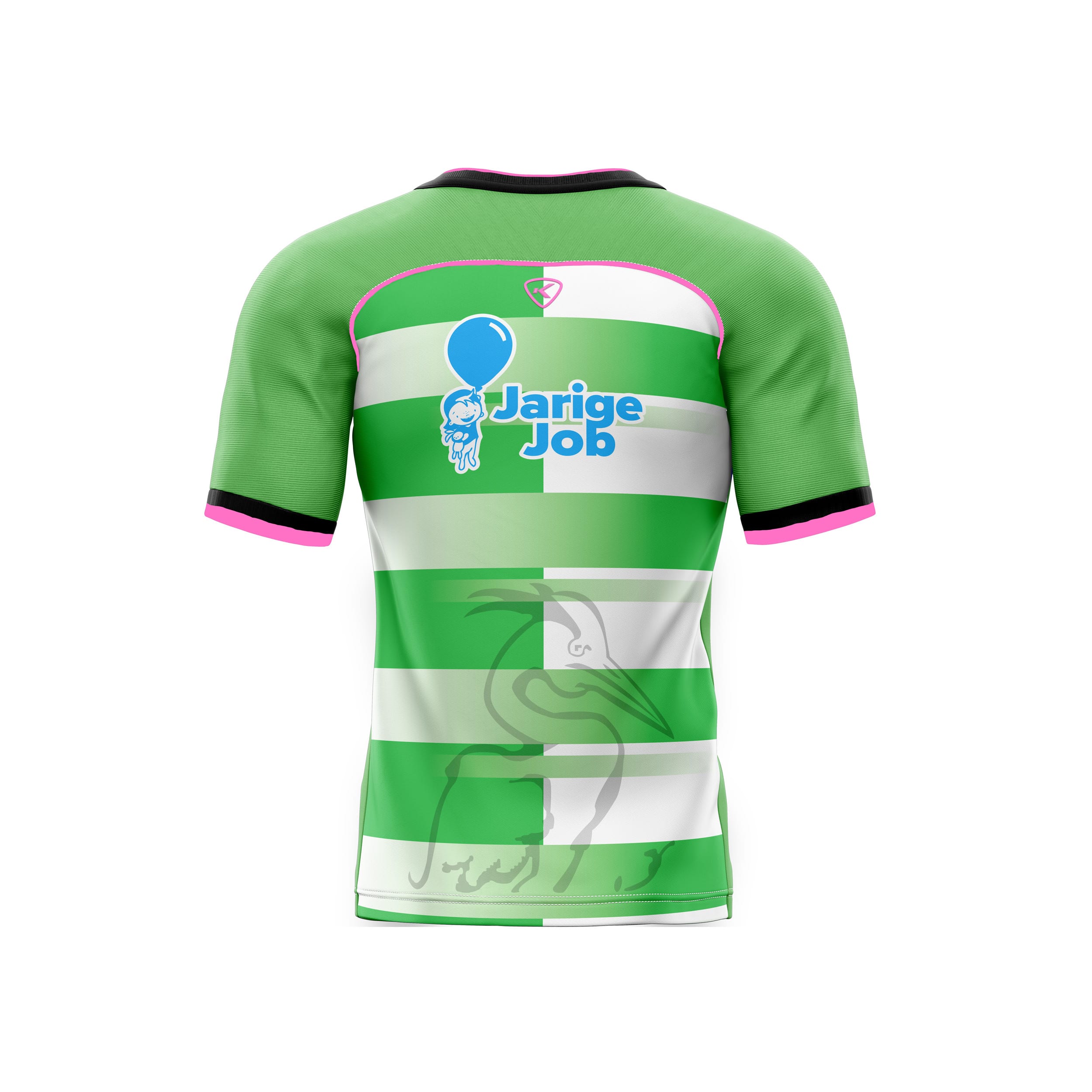 Het Dames v.v. De Wherevogels wedstrijdshirt met korte mouwen in groen, wit, zwart en roze.